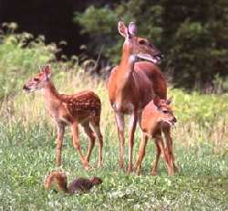 This photo was sent to us by Gary Fitzgerald of Rustic Originals to place in our Backwoods Beauty Photo section, but we decided to place it here first. Gary photographed this doe and her two fawns with the squirrel a few weeks ago in July. To see more of Gary's work visit his web site at: http://www.il-millstadt/rustic.html.