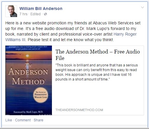Here is a screen capture from Bill's Facebook page. After using my narration for the forward to Bill's book - the one I used to shed 55 pounds after my heart attack - in early promotion, Bill decided he'd prefer to narrate it himself. By then, I was on my way, narrating and producing uplifting nonfiction audiobooks.
