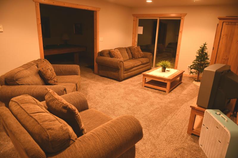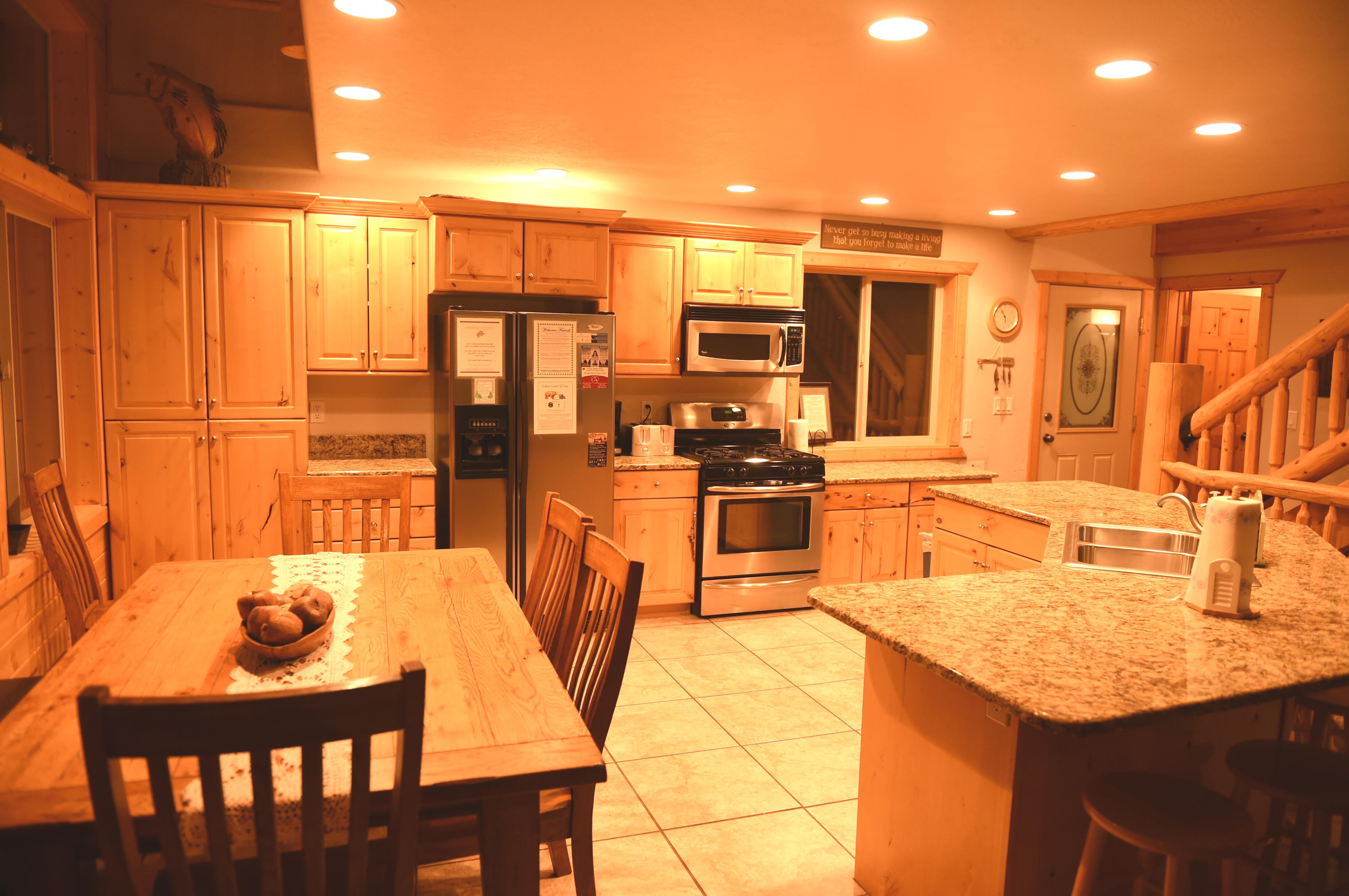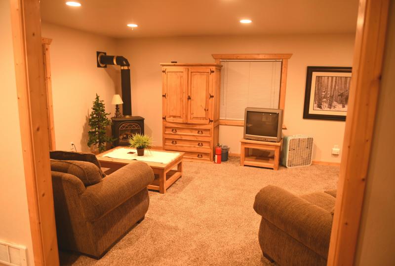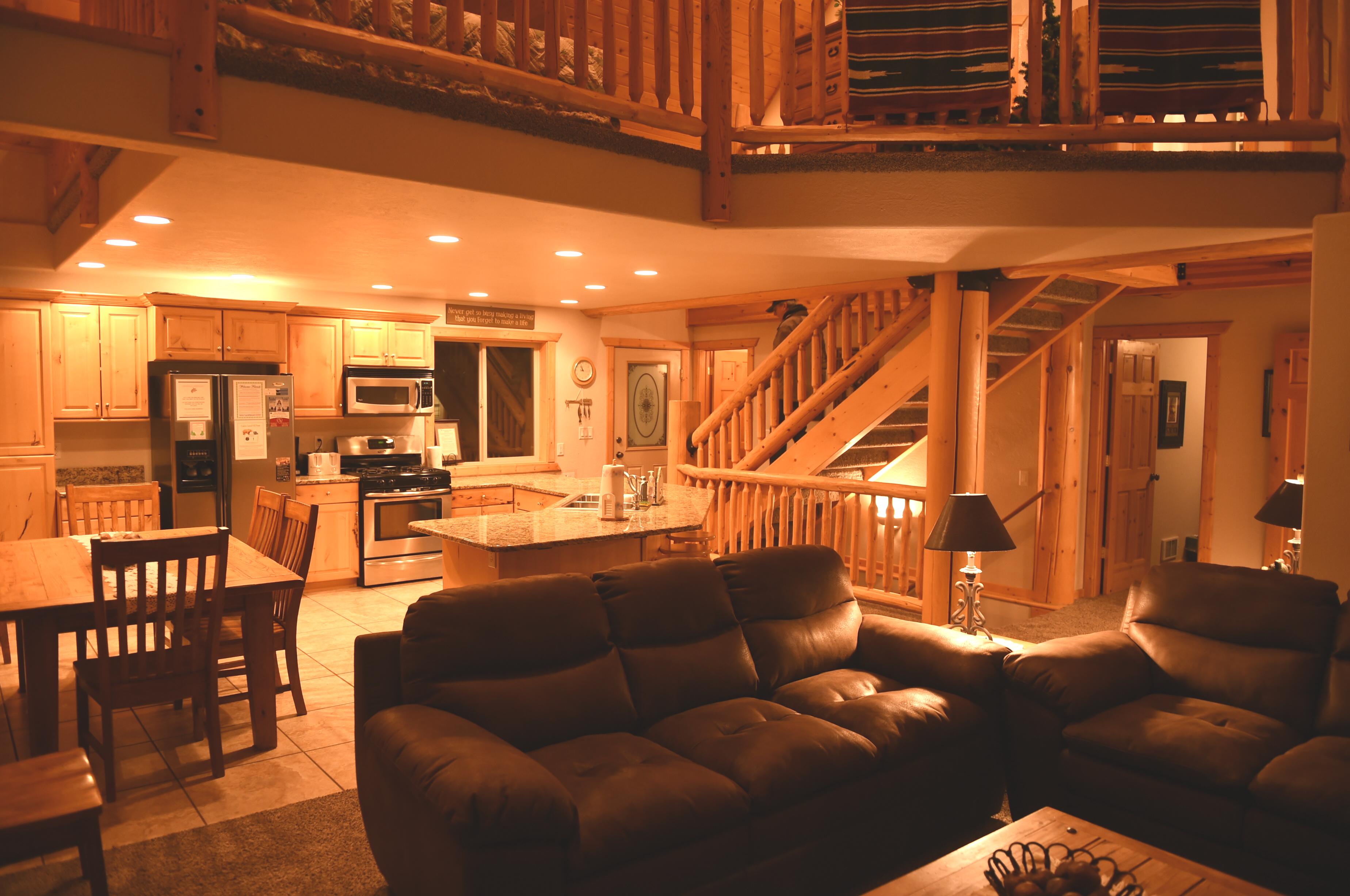 Main Level: (2-Bedrooms/ 2 Bathrooms)Living room has Satellite T.V; Fireplace, Full Kitchen-table seats 6-8 guests, Kitchen counter will seat up to 8 guests. Kitchen is equipped with dishwasher, microwave, fridge with ice maker, gas stove, small appliances, pots & pans, dishes and utensils and common bath. Wrap